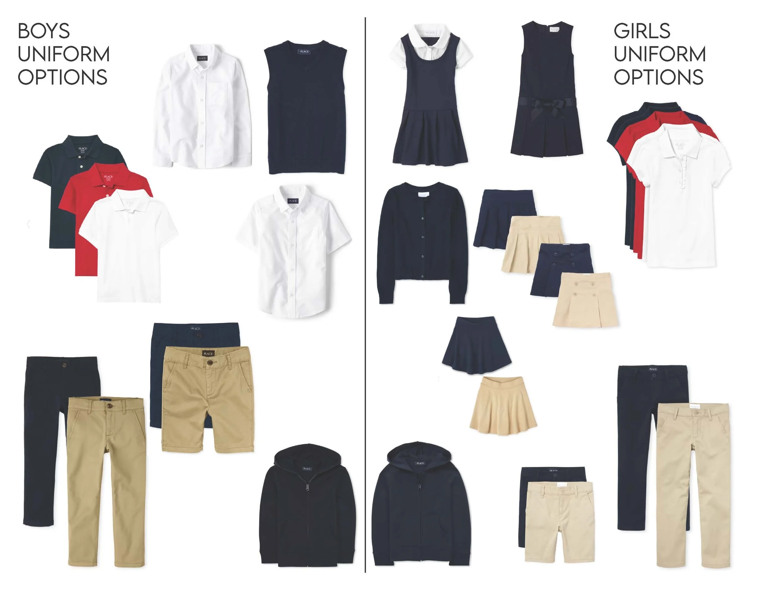 Uniform bottoms must be purchased in the uniform section of any retail store. (Example: Children’s Place, Target, Walmart, Kohls, etc.)